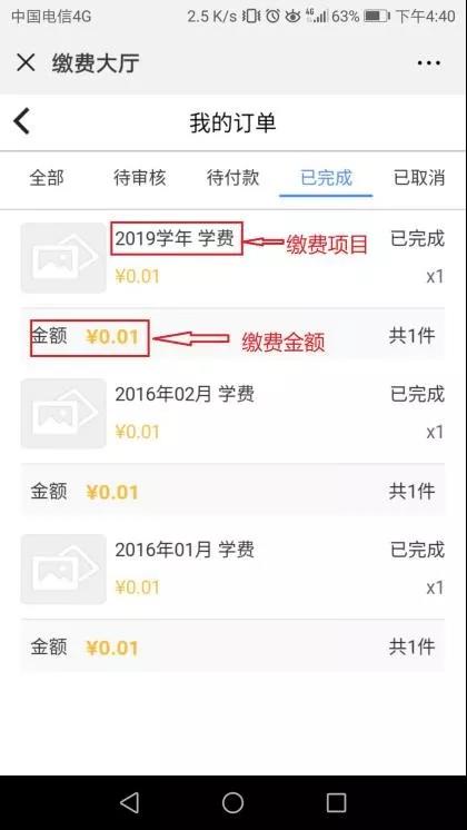 答:缴费完成后可在平台右下角菜单“我的”->“我的订单”选择已完成中查阅相关信息,也可以在“我的收据”栏目中查阅到电子凭证,如需要纸质发票,可在开学后前往财务处领取。