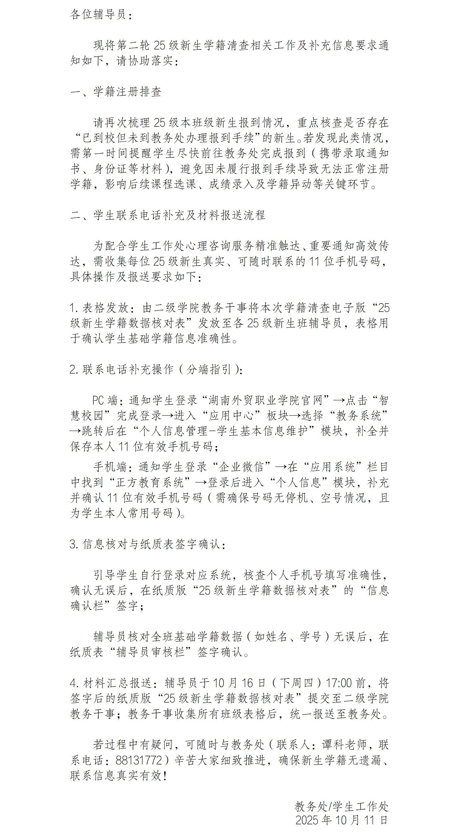 关于开展第二轮25级新生学籍清查及补充学生联系信息的通知