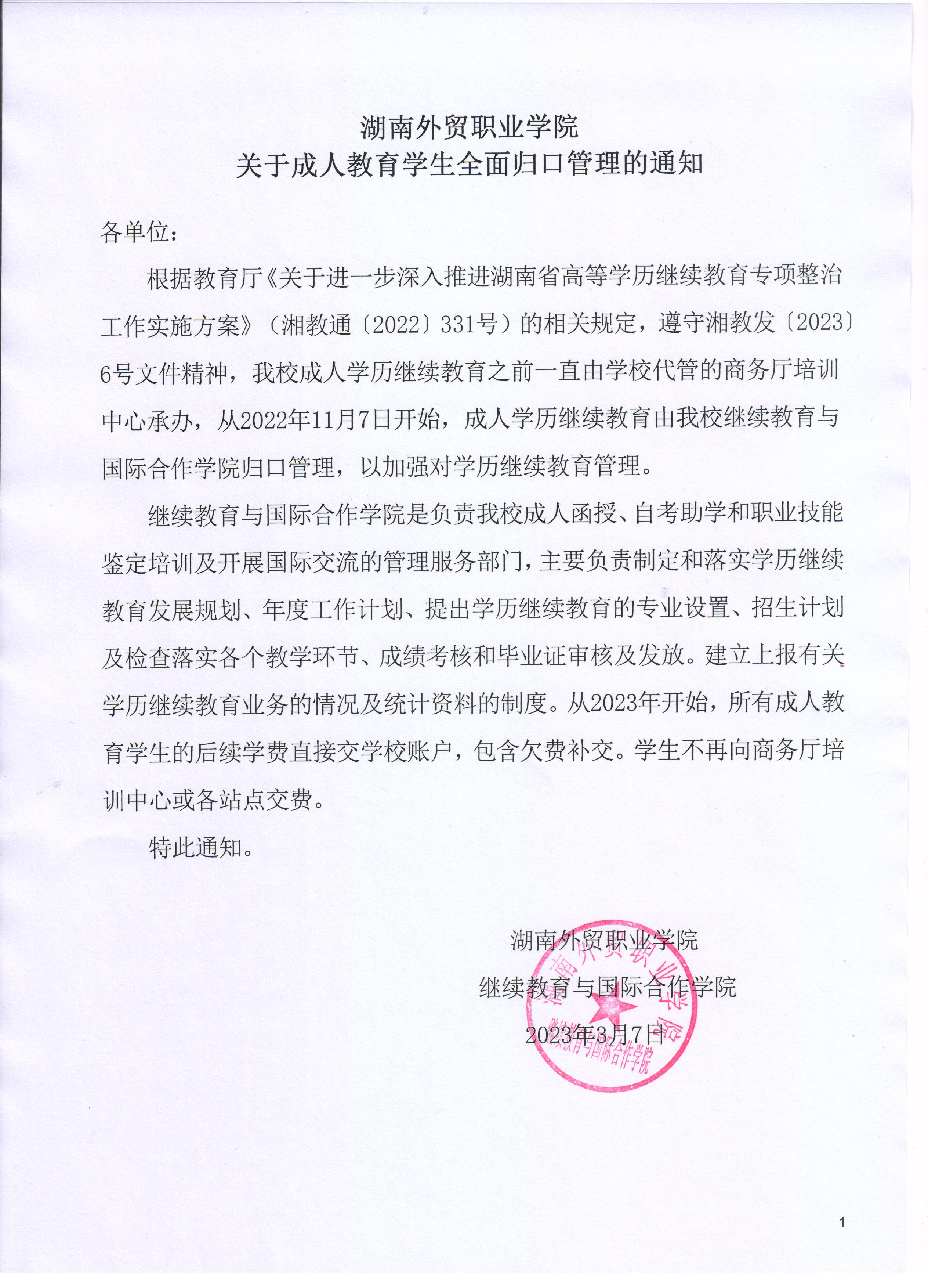 湖南外贸职业学院关于成人教育学生全面归口管理的通知