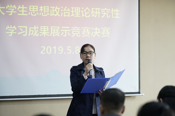 5月8日下午,第五届大学生思想政治理论课研究性学习成果展示竞赛决赛在学术交流中心208会议室举行。思政课部部长章玲为比赛致辞,她指出研究性学习比赛既推动了习近平新时代中国特色社会主义思想进课堂、进头脑,又可以传承五四精神、表达爱国情怀。她希望当代大学生能够自觉学习贯彻习近平新时代中国特色社会主义思想,做新思想的传播者和实践者,为实现中国梦努力。