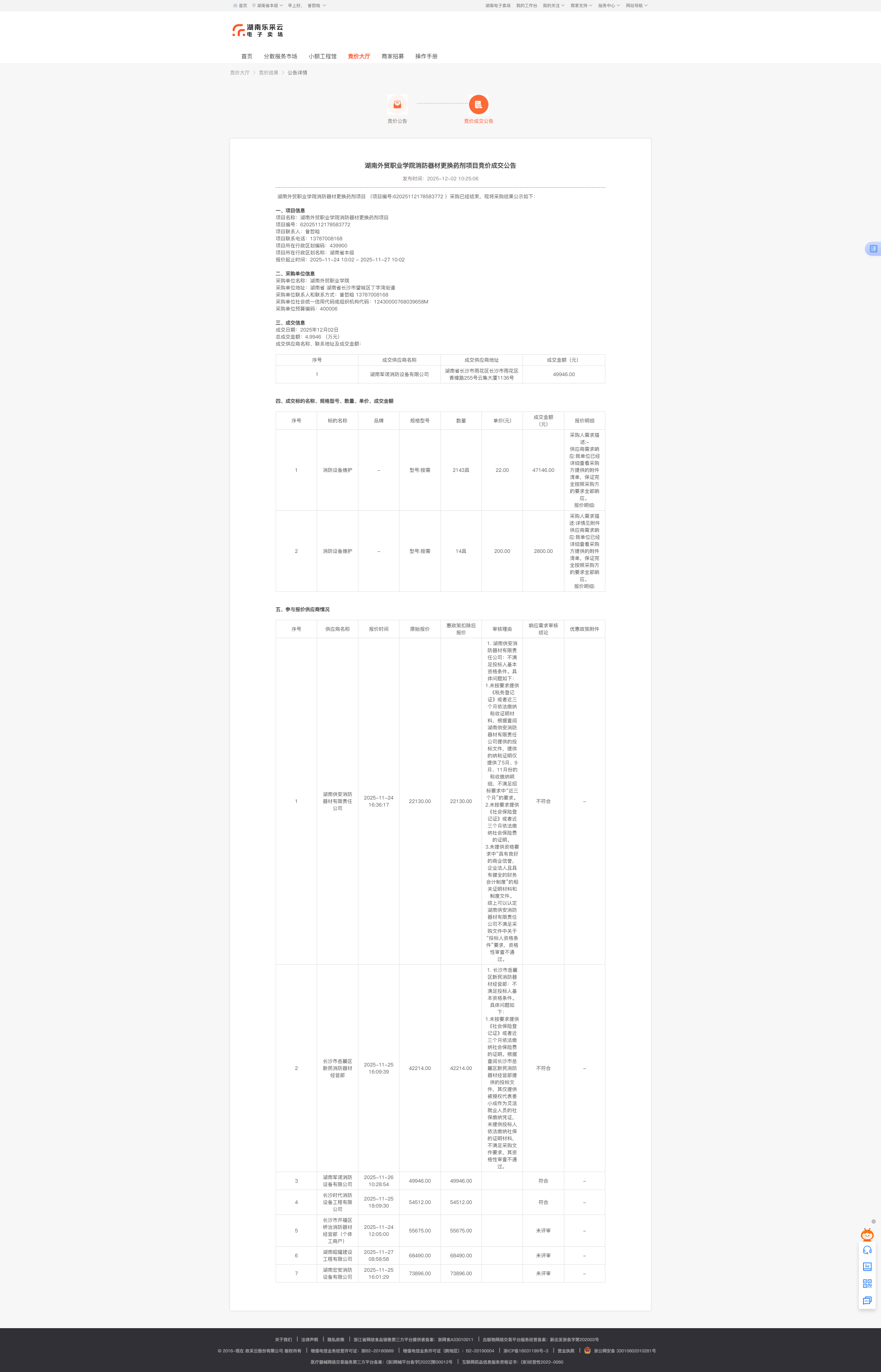 湖南外贸职业学院消防器材更换药剂项目竞价成交公告