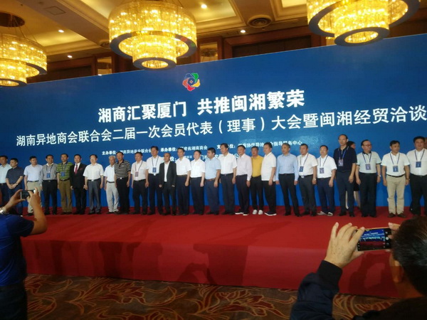 湖南省异地商会联合会二届一次会员代表(理事)大会暨闽湘经贸洽谈会9月9号--9月11号在福建厦门市翔鹭国际大酒店隆重召开,湖南省商务厅等政府部门以及来自全国及海外的各地湖南商会代表和企业家600多人参加此次大会,我校校长陈波,副校长桂诚,校企合作办主任李玉明前往参加。洽谈会上各方达成了多个合作意愿,签订了多个合作协议。