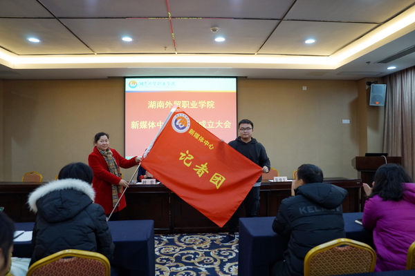 然后,叶春霞宣布新媒体中心记者团正式成立并授团旗。彭俊文接团旗并代表全体团员发言。