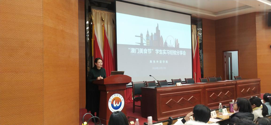 为了帮助学生树立正确的就业观,合理规划大学生活,2019年12月17日下午18:30,商务外语学院在南教112举办“澳门美食节”实习学生经验分享会”。出席本次活动的有企业方湖南湘辉人力资源有限公司国际事业部肖智红女士、商务外语学院院长刘慧君老师、商务外语学院副院长刘家洲老师、商务外语学院团总支书记罗芬老师、商务外语学院专业带头人、商务外语学院教研室主任以及应用日语专业辅导员以及各班学生代表。