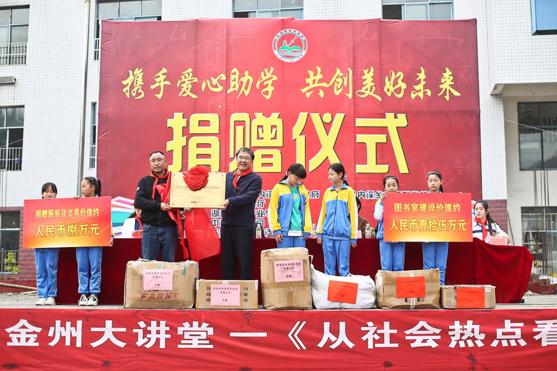 10月12日,湖南外贸职业学院校团委“雏鹰”社会实践服务队联合湖南省商务厅、金州律师事务所、长沙市清水塘二小对龙山县内溪乡九年制学校开展“携手助学,共创美好未来”为主题的捐赠校服、运动服、图书、体育用品活动。