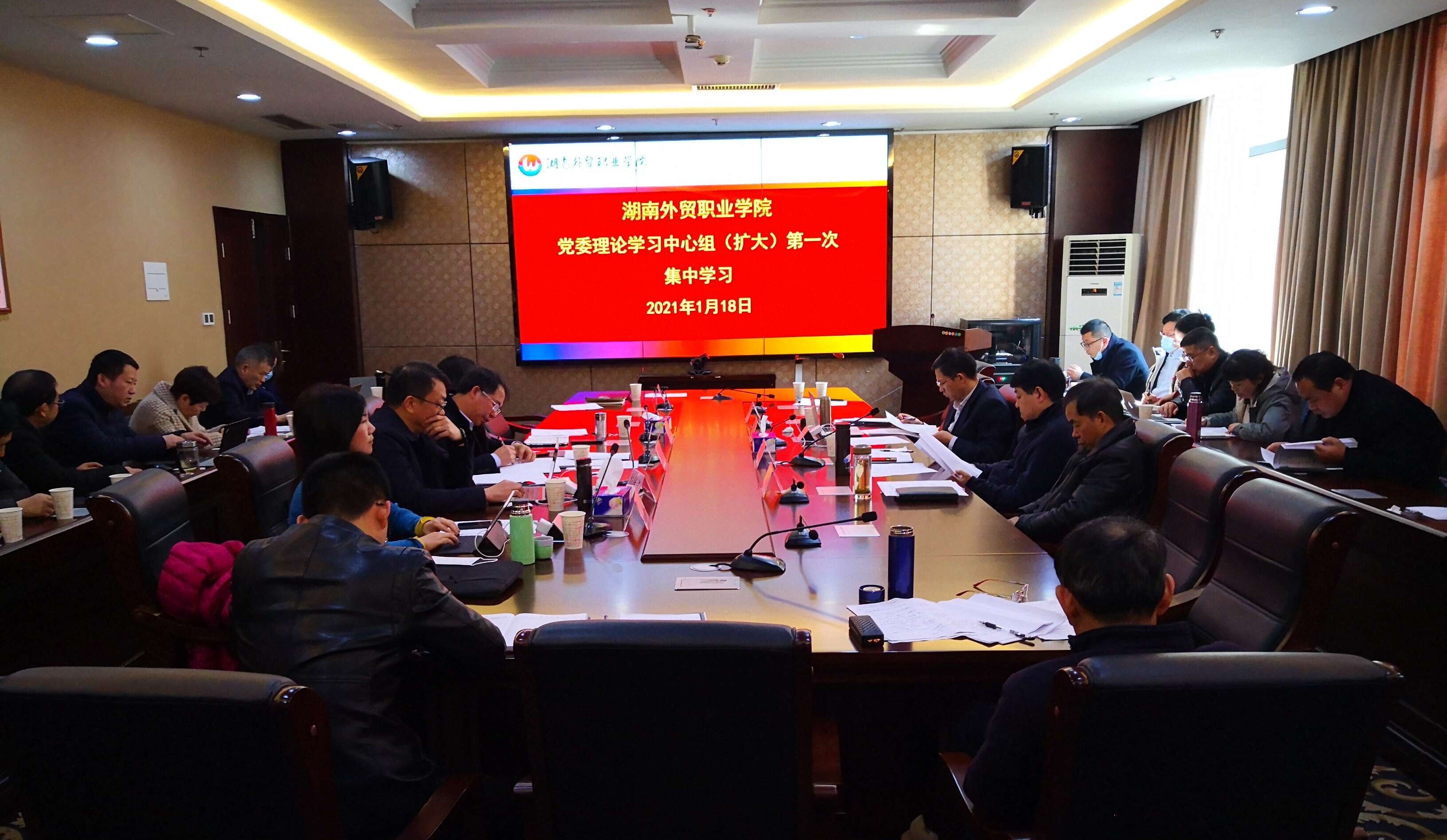 1月18日,校党委理论学习中心组召开第一次扩大学习会议,传达学习《中共湖南省商务厅党组落实意识形态工作责任制实施办法》和习近平在省部级主要领导干部学习贯彻党的十九届五中全会精神专题研讨班开班式上的重要讲话精神,研讨2021年学校工作和“十四五”发展规划编制。