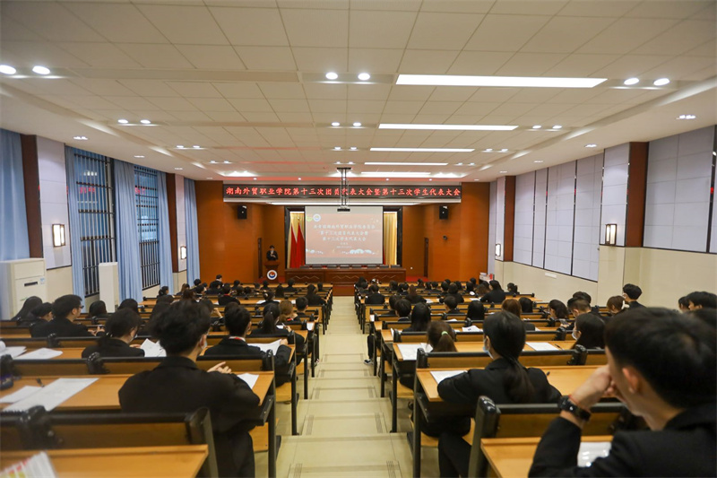 2021年11月5日中午12时,共青团湖南外贸职业学院委员会第十三次团员代表大会暨第十三次学生代表大会伴随着雄壮的国歌隆重开幕。接着,叶春霞为大会作开幕式致辞。她肯定了上届团委、学生干部所做出的成绩并对新一届团委、学生干部做出了期望。随后,校团委副书记许杏宣读学校党委和上级学联关于同意我校召开“双代会”的批复。湖南外国语职业学院,湖南水利水电职业技术学院,湖南工业职业技术学院以及湖南现代物流职业技术学院等兄弟高校纷纷发来贺电,预祝大会圆满成功。