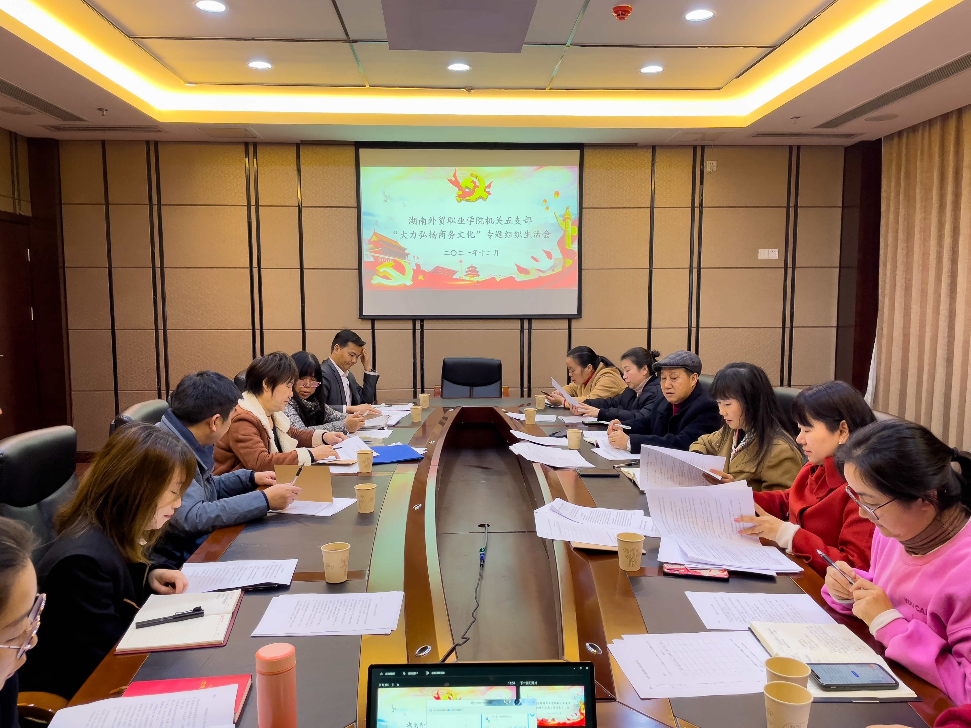 本网讯(通讯员 任玫、彭齐林)12月8日下午14时,机关五支部在学术报告厅三楼308会议室召开了“大力弘扬商务文化”专题组织生活会。应到党员17人,实到党员12人,5人因公请假。学校党委委员、副校长铁明太到会全程指导。会议由党支部书记叶春霞同志主持。