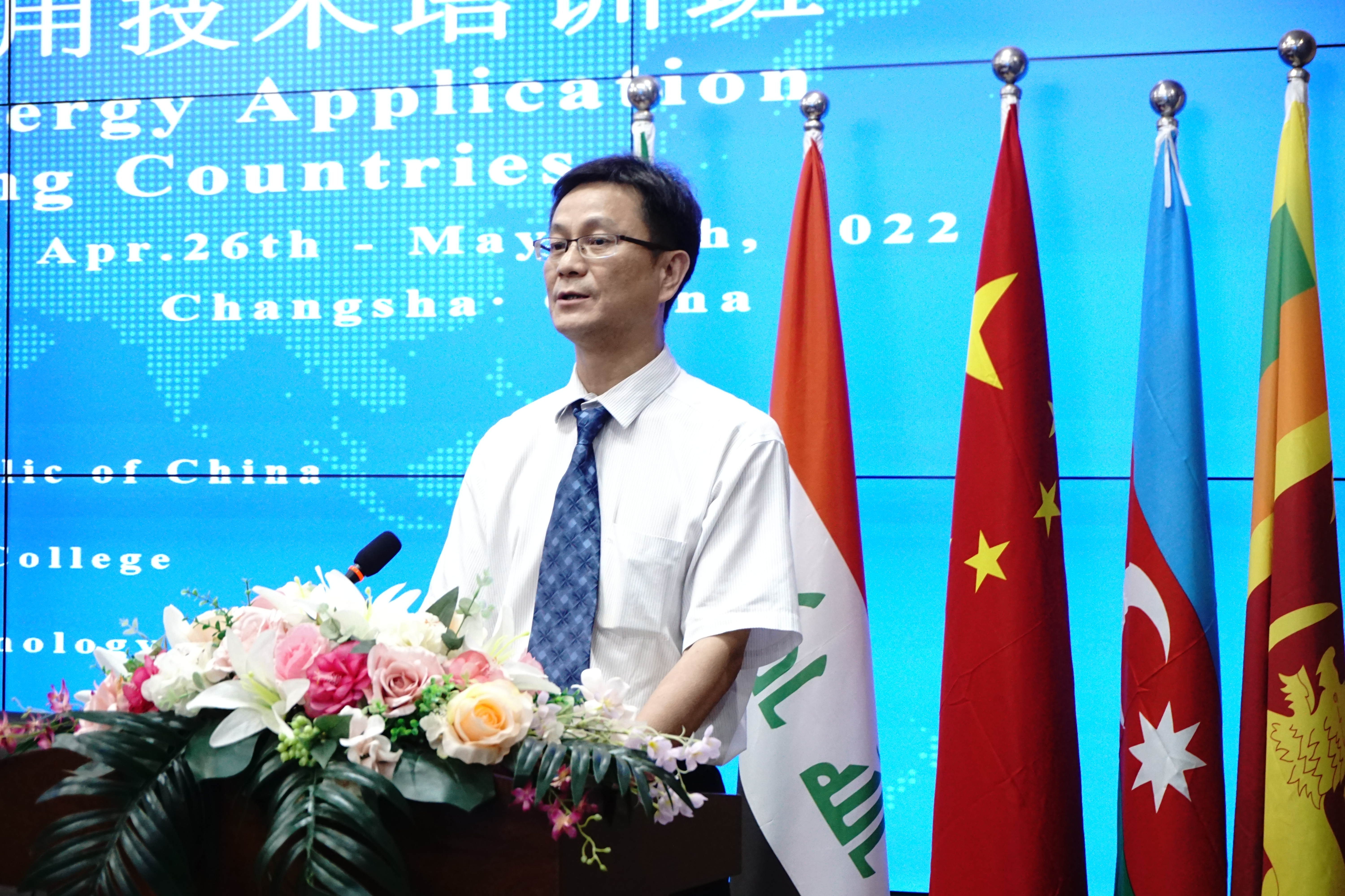 本网讯(援外培训学院 欧阳玲 谭媛媛)4月26日下午2点40分,发展中国家清洁能源应用技术培训班开班仪式在湖南外贸职业学院学术交流中心206会议室举行。湖南省商务厅对外投资和经济合作处调研员刘军廷先生,湖南外贸职业学院副院长桂诚先生,长沙理工大学能源与环境工程研究所副所长刘亮先生出席了会议并发表讲话,来自埃塞俄比亚,阿塞拜疆,斯里兰卡和伊拉克四国28名研修班学员在线上参与了开班仪式。
