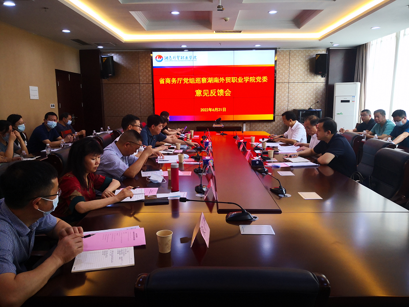 本网讯(党政办 於燃原)根据省委巡视工作统一部署和省商务厅党组巡察工作安排,2022年6月21日,省商务厅巡察组向我校党委反馈巡察情况。省商务厅党组成员、副厅长杨中万,省纪委监委派驻省商务厅纪检监察组副组长高峰,省商务厅机关党委常务副书记彭澎出席,学校党委成员及各部门党政负责人参会。