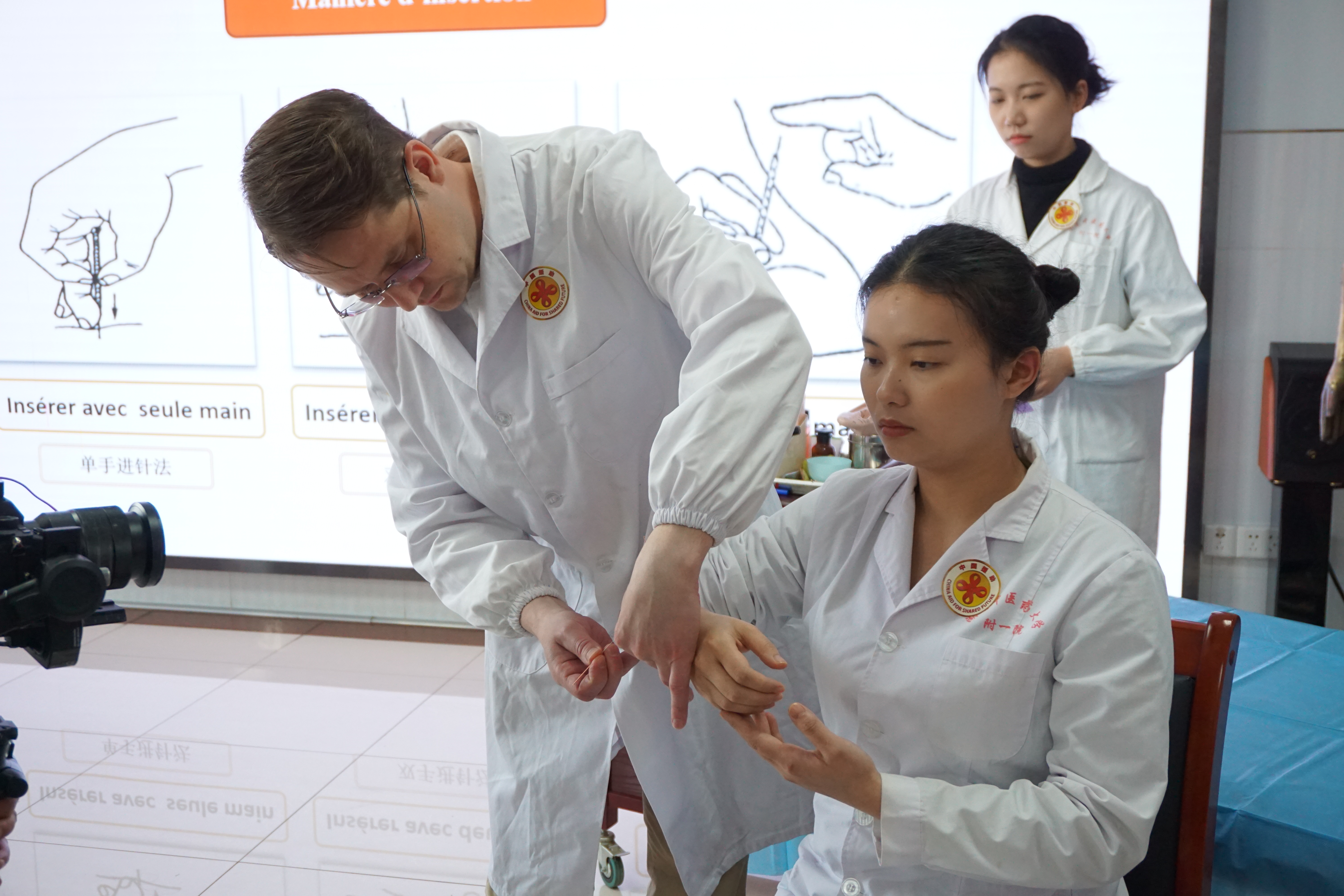 随后,中医附一章薇教授给学员们介绍了中医针灸的优势和常用的临床技术,并现场演示了针灸的五大疗法——针刺疗法、艾灸疗法、火罐疗法、耳针疗法和刮痧疗法。