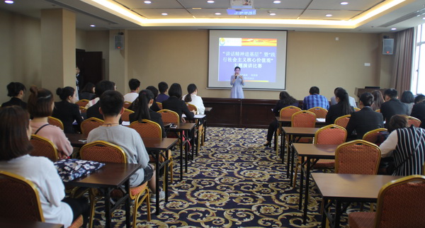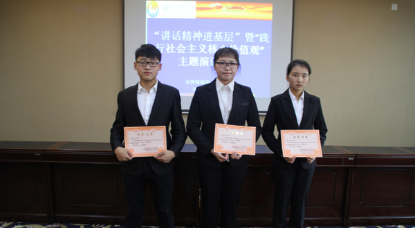 为推动我校广大师生党员认真学习《习近平总书记系列重要讲话读本》以及推动青年学生践行“社会主义核心价值观”,5月26日下午,由宣传统战部和校团委联合举办的 “讲话精神进基层”暨“践行社会主义核心价值观”主题演讲比赛在学术交流中心208会议室举行。学生处副处长龙军、招生就业处副处长杨剑、宣传统战部副部长罗俐琳、团委副书记叶春霞、机关党总支梁伟老师担任本次大赛的评委,比赛由柳最主持。