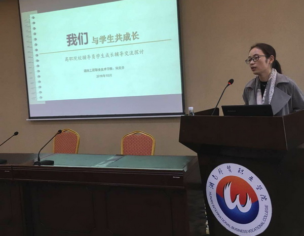 随后,中南大学心理健康教育中心马晓虹老师、湖南工程职业技术学院心理健康教育中心主任何炎芬老师分别做了《心理问题的识别与辅导员谈话技巧》《我们与大学生共成长》的专题讲座。辅导员肖璐、李佳丽、李程、胡薇薇、吴柳林老师分别以《十字路口 伴你左右》《情之所伤 温暖至上》《用尊重与关爱开启心灵之门》《做个温暖的辅导员》《辅导员职业能力大赛与学生工作》为主题做了典型工作案例分析和工作交流。辅导员湛雁凌、肖坚、郭长明老师就参加湖南省委教育工委组织的辅导员专题培训分别以《辅导员科研能力提升》《职业规划》《法律法规》为主题进行学习分享。为了进一步拓展辅导员业务能力,学院大学生创业就业指导中心主任刘恋就大学生就业创业指导工作做了介绍与交流;校团委副书记叶春霞就大学生活动策划与组织做了交流。同时,艺术学院党总支书记任碧芳以《辅导员成长》为主题,与大家一起分享了自己的成长经历;外国语学院党总书记潘雪义以《悦生活 乐工作》为主题与辅导员进行了互动沟通;会计学院党总支书记周红波分享了她从事学生管理工作以来与辅导员面对的一切,并时刻为辅导员的付出所感动;国际商务学院党总支书记潘文利则以辅导员团队建设为内容分享了国际商务学院在辅导员队伍建设方面的经验。