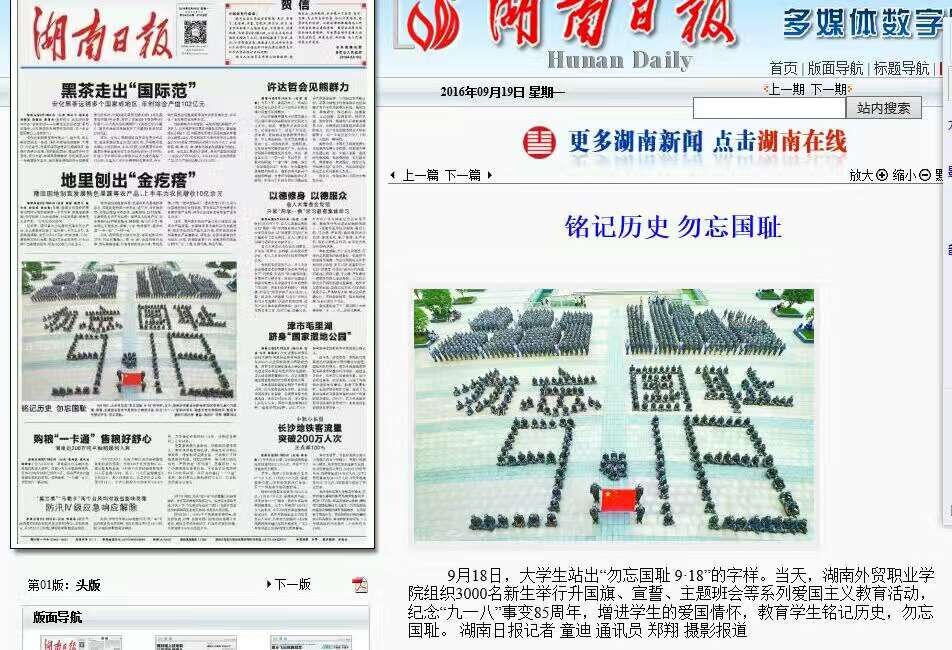 9月18日,我校3000名2016级新生举行升国旗、宣誓、主题班会等系列爱国主义教育活动,纪念"九一八"。增强学生们的爱国情怀,教育学生勿忘国耻、铭记历史,圆梦中华。