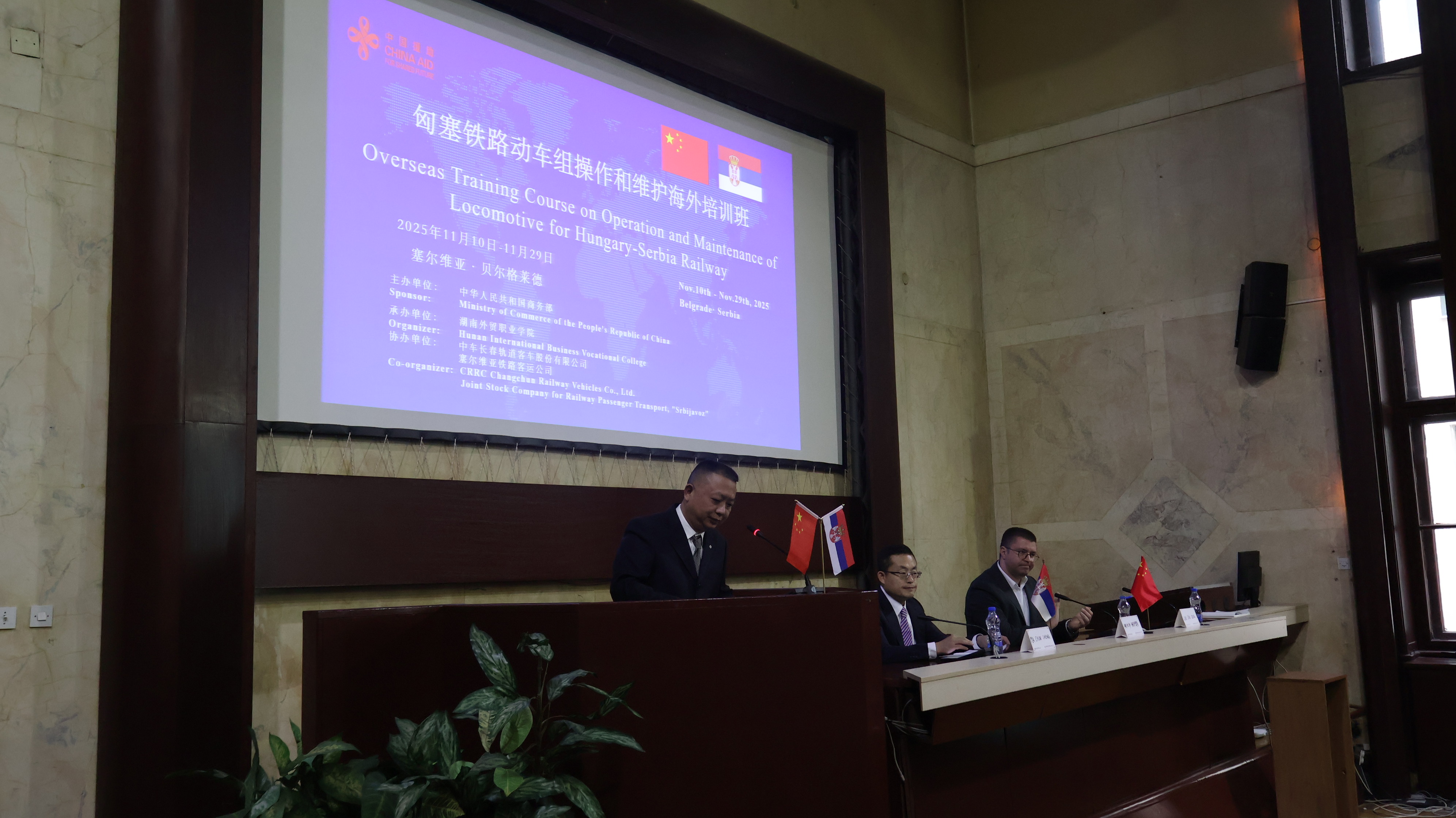 当地时间2025年11月10日,“匈塞铁路动车组操作和维护海外培训班”开班仪式在贝尔格莱德举行。塞尔维亚铁路客运公司总经理柳比沙·佩伊契奇、中车长客海外事业部副总经理马春生、湖南外贸职业学院副校长曹建清、援外培训学院副院长傅云辉出席会议并发表讲话。共有来自塞尔维亚交通部、塞尔维亚铁路客运公司、中车长客、中车长客塞尔维亚子公司等近百位铁路运输行业从业者参与本次开班仪式。