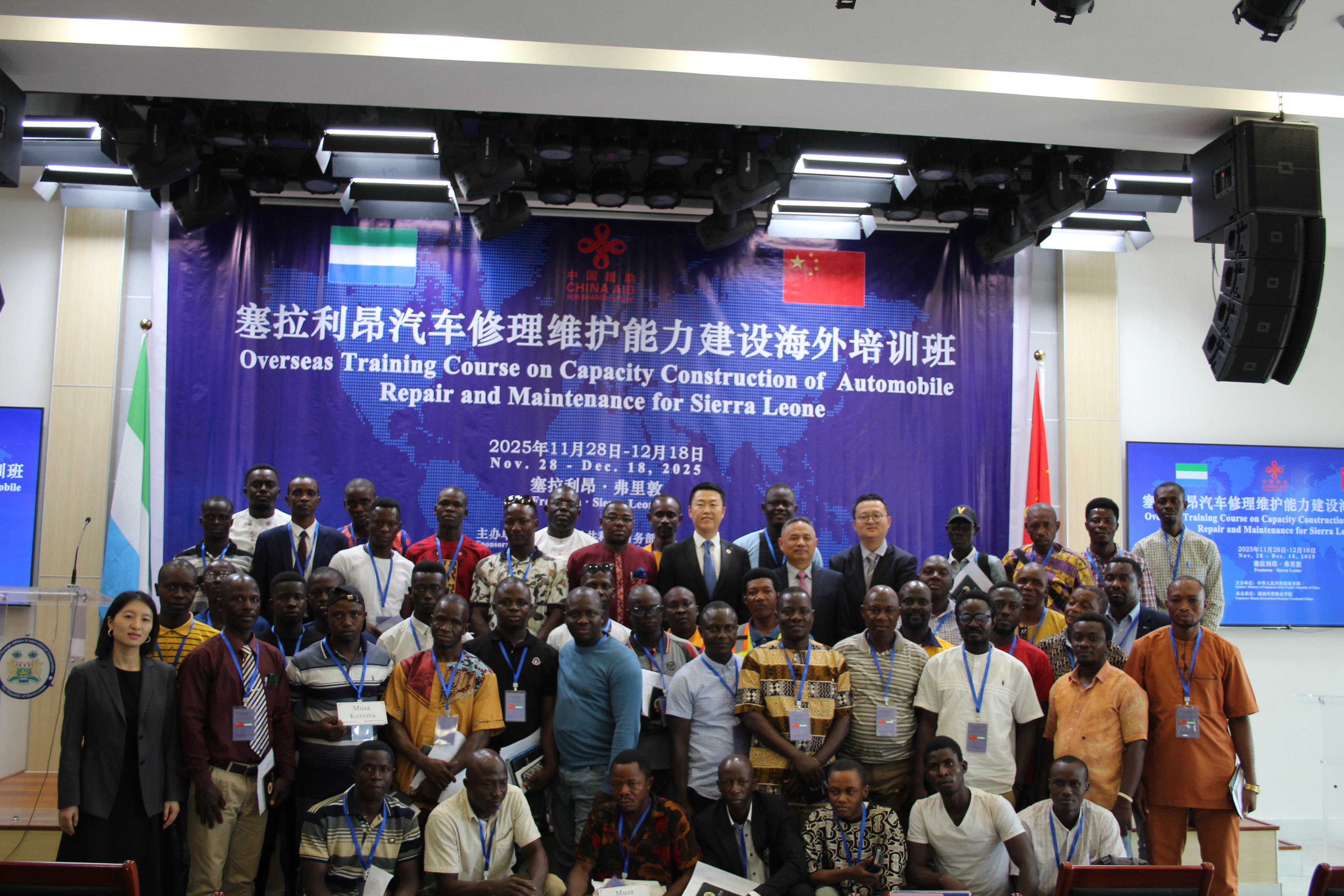 11月28日,由中国商务部主办、我院承办的"塞拉利昂汽车修理维护能力建设海外培训班"开班仪式在塞拉利昂首都弗里敦隆重举行。中国驻塞拉利昂大使馆经商处参赞王鹏先生、我院副校级领导严若红先生、塞拉利昂外交与国际合作部总司长富兰克林·法翁杜先生、塞拉利昂技术与高等教育部职业教育司司长阿布达·塞内西先生等重要嘉宾出席仪式并发表致辞,共同见证这一深化两国职业技能合作的重要时刻。来自塞拉利昂各地的50名学员齐聚一堂,开启为期21天的专业技能提升之旅。